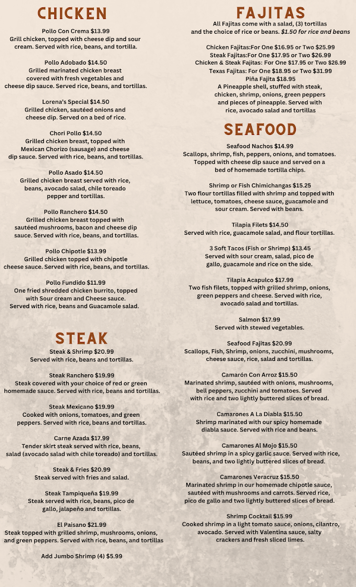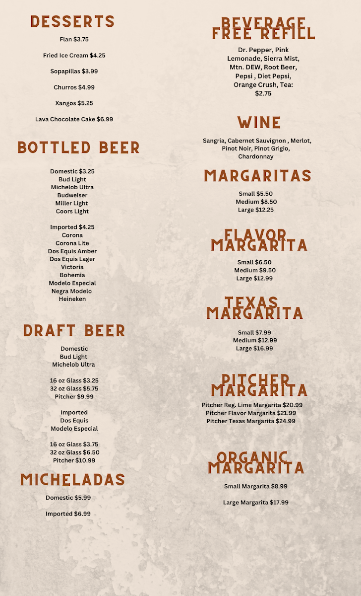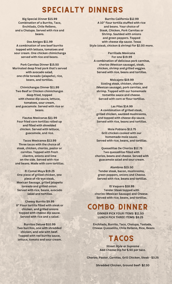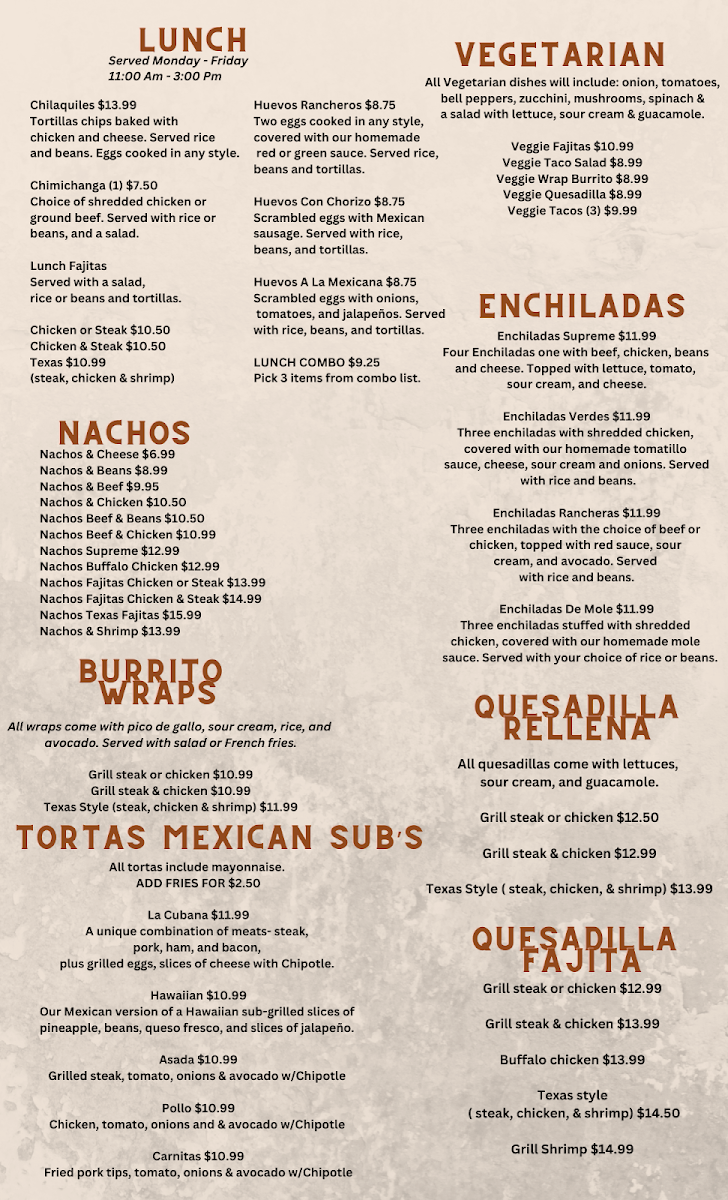 From hearty specialty dinners like Carne Asada or Mole Poblano to shareable options such as nachos topped with a choice of chicken, beef, or shrimp, the menu balances familiar favorites with fresh, satisfying ingredients. Light soups and salads work well for a midday meal, while dishes like chicken fajitas and chimichangas provide a flavorful option for those seeking something a bit more filling.
