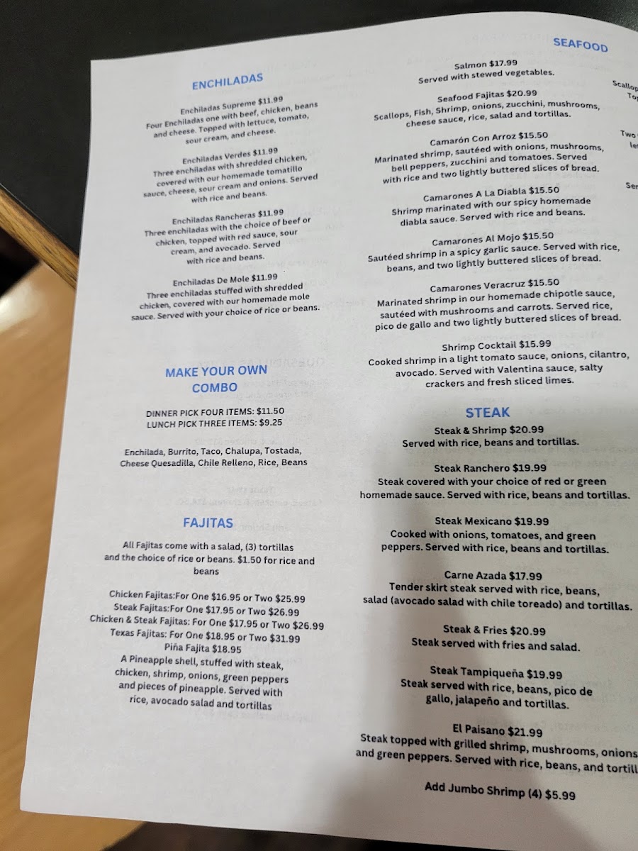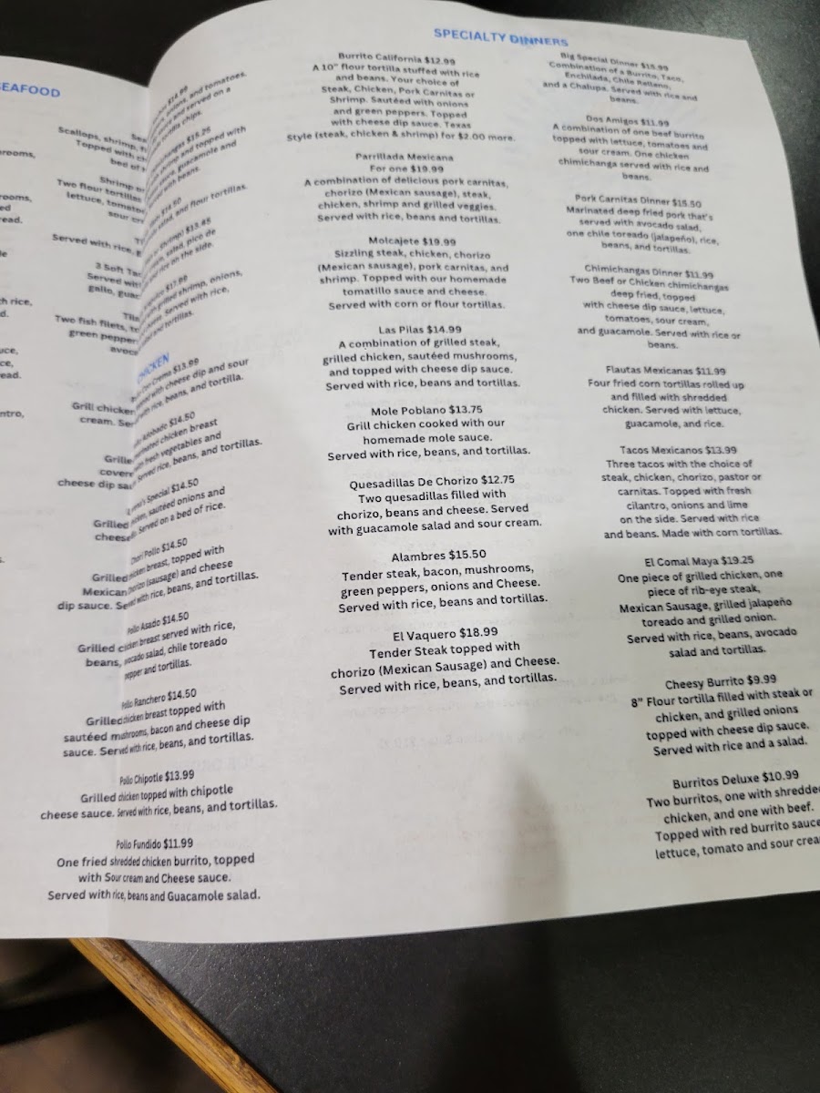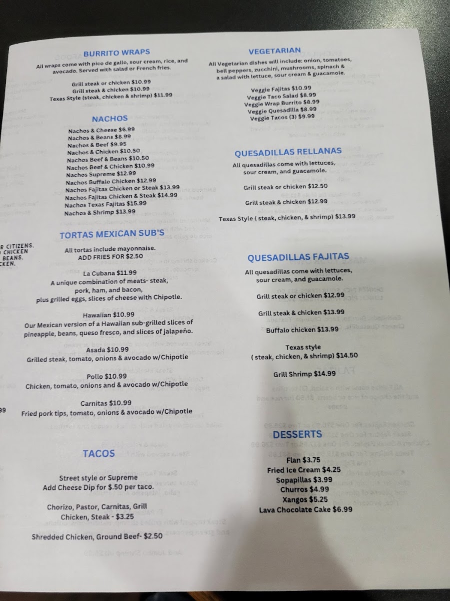 From hearty specialty dinners like Carne Asada or Mole Poblano to shareable options such as nachos topped with a choice of chicken, beef, or shrimp, the menu balances familiar favorites with fresh, satisfying ingredients. Light soups and salads work well for a midday meal, while dishes like chicken fajitas and chimichangas provide a flavorful option for those seeking something a bit more filling.